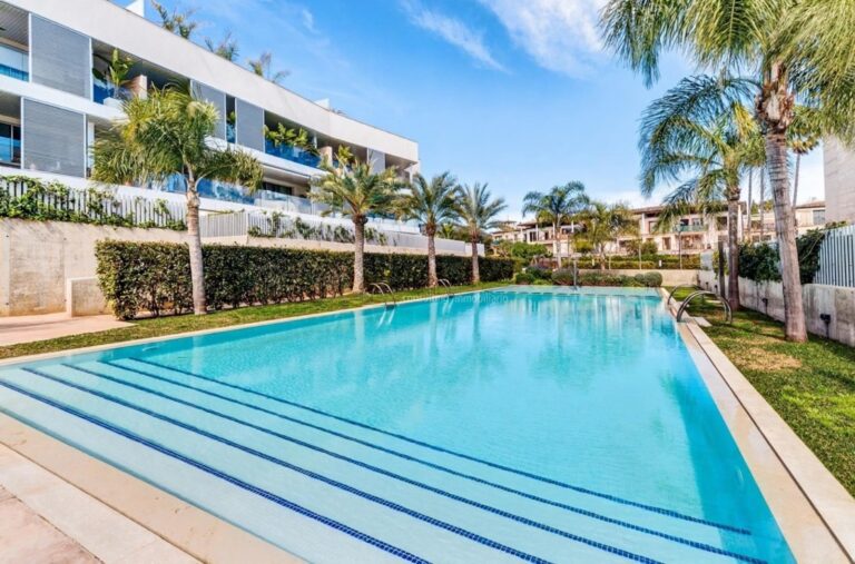 With an excellent location next to Son Vida, in a privileged setting in Palma, surrounded by nature and opposite one of the most prestigious golf courses on the island, this magnificent ground floor apartment with an excellent south orientation is situated within a very well maintained private residential complex that offers extensive garden areas, two fantastic swimming pools and spacious wellness rooms with gym, sauna and heated pool where you can relax and have time for yourself. The highest qualities combined with an impeccable modern design and maximum comfort mark this large ground floor where the maximum energy efficiency has also been achieved, another of the key points in the construction of the house. It has a surface area of 443 m2, of which 317 m2 correspond to living space, porches and terraces, plus a large private garden of 64 m2, making it the ideal outdoor setting to share with friends and family. The house has been developed on a main floor from which to access a lower level. On the main floor there is a large open plan living room with fireplace, dining room and modern kitchen; the master bedroom with en suite bathroom and three further bedrooms, two of them also with en suite bathrooms. From the living room and the master bedroom there is direct access to the large terrace and garden and from the rest of the rooms there is also access to the rear garden of the property. On the lower level there is a lounge with a cocktail-bar to enjoy a private space where you can spend a pleasant leisure time. A bedroom with en-suite bathroom and a room currently used as an office complete this level from which there is direct access to the building’s garage. Note that the property includes three parking spaces and a storage room. FEATURES: -Ducted hot/cold air conditioning, underfloor heating, aluminium/climalit, fireplace, tiled floors, fitted wardrobes.ç -Open plan fitted kitchen, laundry room. -Private terrace, private garden, communal swimming pools, communal gardens, fitness room, spa area. -Underground garage, storage room. LOCATION: -South facing -Green surroundings, in front of the golf course, 5 min. from the centre of Palma, close to schools and children’s playgrounds, next to sports centres, beaches within walking distance, excellent access to the whole road network.