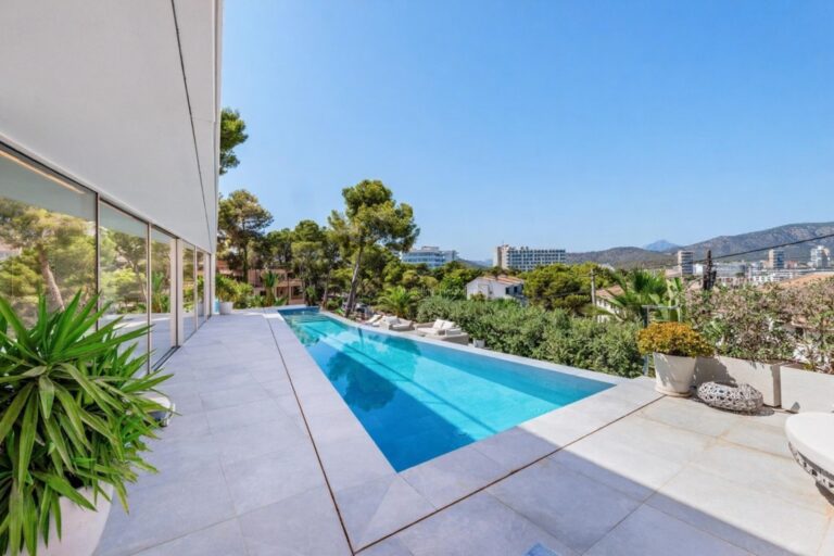 This spectacular new build and large villa has a contemporary architecture and has been designed to fully enjoy both its interiors and its magnificent exteriors with terraces, porches, garden area and large pool with open views over the sea and the coast. It is located a short distance from the beach in the coastal town of Cala Vinyes in the southwest of Mallorca, surrounded by beautiful beaches and cliffs in the municipality of Calviá, with all services close to just 15 min. of palm. It has been built on a plot of 1,300 m2 occupying an area of 400 m2 comfortable and modern is open spaces to the views over the coast and the almost 260 m2 of exteriors that are connected directly to the interior of the house by high glass enclosures that allow a large influx of natural light. Moderna It is developed on two levels plus basement and has five bedrooms with en suite bathroom, fitted wardrobes and dressing room the main one of them in addition to the fantastic sea views. The large open-plan living room on the first level is a space to share and enjoy in connection with the large terrace, the magnificent infinity pool of 40 m2 and the spectacular surroundings. It is a large room with a fireplace that has the living room, dining room and Moderna fully equipped kitchen. A room is also located on this level. On the upper floor there are the four remaining rooms in connection with the exterior and the unobstructed views of the sea environment. The Moderna villa has a magnificent private garage of 66 m2 to increase the comfort of its owners. It should be noted that the villa has been built with the best materials and with exceptional qualities that make it a smart home with a high level of comfort facing the sea. FEATURES: -Reversible hot/cold air conditioning, underfloor heating, double glazing, skylight, lacquered wooden doors, alarm pre-installation, home automation, built-in wardrobes, dressing room, controlled mechanical ventilation system. -Equipped kitchen, laundry area -Porches, terraces, garden, large infinity pool, garage LOCATION: -300 m from the beach, close to restaurants, close to shops, close to all amenities, 15 min. of Palma